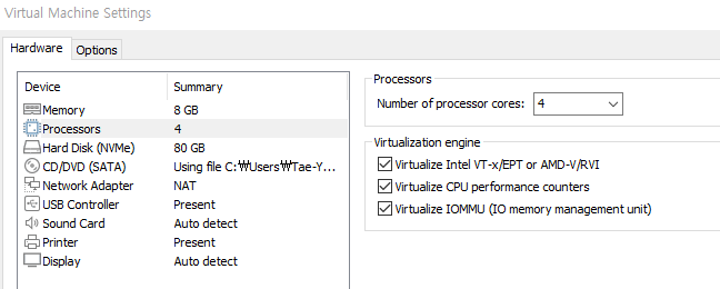 "Processors"를 클릭하시면 우측에 "virtualization engine" 이라고 나와요.